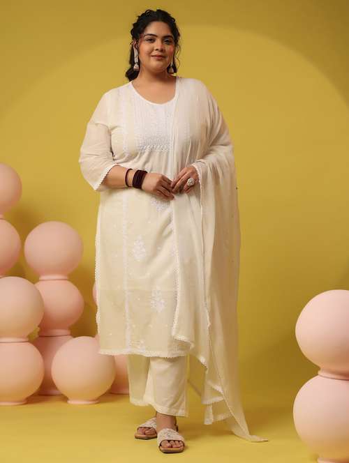 women solid with work three quarter sleeve kurta pant with dupatta set
