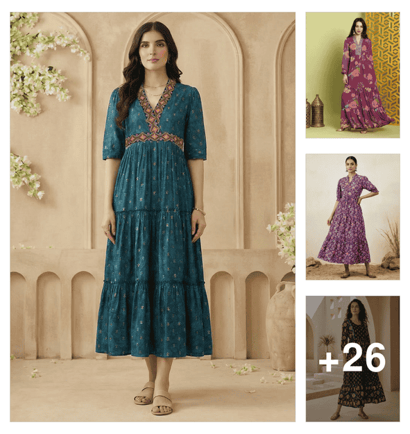 globus women blue ethnic block print mandarin collar flared hem tiered maxi fusion dress
